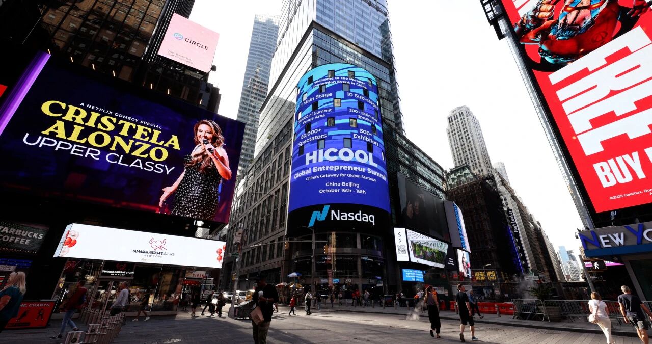 HICOOL2025全球创业者峰会城市大屏亮相纽约时代广场。
