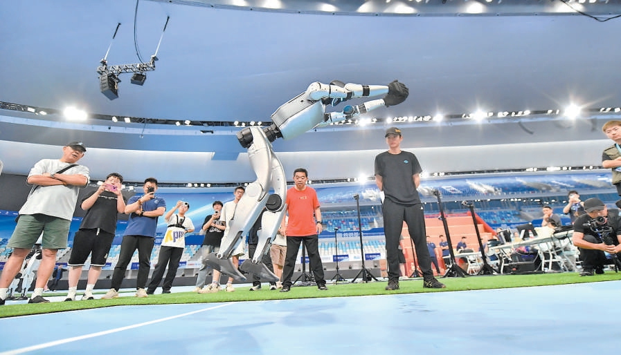 北京科技职业大学自主研发的“小巨人”将参加单机舞蹈、田径400米和1500米的比赛。“这些赛项最考验机器人的平衡力和稳定性,我们力争跑得又快又稳,舞出花样、不摔跤。”团队负责人、机电工程学院教师邱钊鹏说,师生们对“小巨人”的关节进行了算法精调,反复调试电机机械轴、传感器等关键零件,“我们给它安装了刚柔耦合关节,构建仿生躯体结构系统,帮助它呈现双臂自然垂摆、双足稳健行走等拟人化的运动姿态,还能完成花手等灵活动作。”