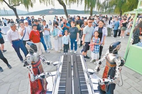 9月12日,作为海淀区在服贸会上的重磅活动之一,以“海光凝夜 淀时成金”为主题的“海淀之夜”活动走进颐和园。图为音乐机器人演奏《歌唱祖国》等乐曲,吸引游客停下脚步聆听。