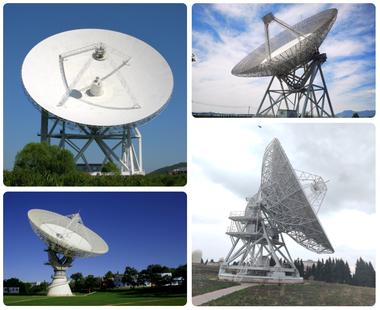 四个台站的射电望远镜:上海天马站(左上),北京密云站(右上),云南昆明站(左下),新疆南山站(右下)