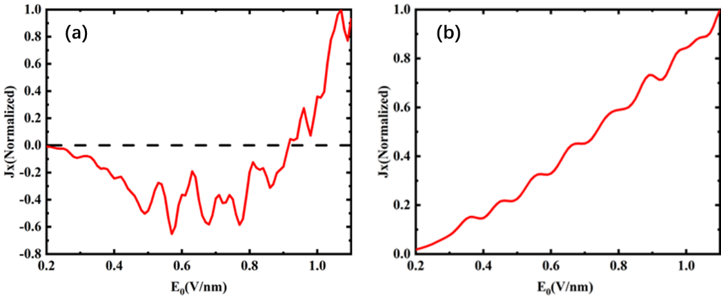 光电流随激光峰值场强的变化,入射波长4μm,(a)脉宽26fs,(b)脉宽13fs