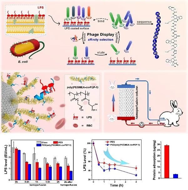 具体来看,团队以大肠杆菌内毒素为模型,通过噬菌体表面展示迭代亲和筛选和内毒素解毒活性筛选,发现了一种对靶标内毒素具有高亲和力、高特异性和高解毒活性的内毒素亲和肽。该多肽不仅可以实现对内毒素与其他血液成分的精确区分,而且能够实现对特定种类内毒素分子的精准识别与清除。由此设计的肽基聚合物可以将脓毒症家兔血液中的内毒素水平从2.63±0.01降低到0.78±0.05 EU/mL (清除率> 70%),显著缓解内毒素引起的多器官损伤和脓毒症预后。