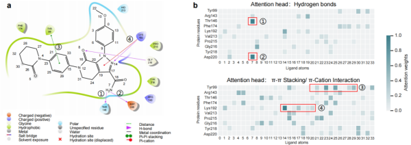 左侧为薛定谔软件分析的蛋白质-小分子相互作用关系图;右侧是PocketGen两个注意力矩阵头的热图,与左侧相互关系成功对应。
