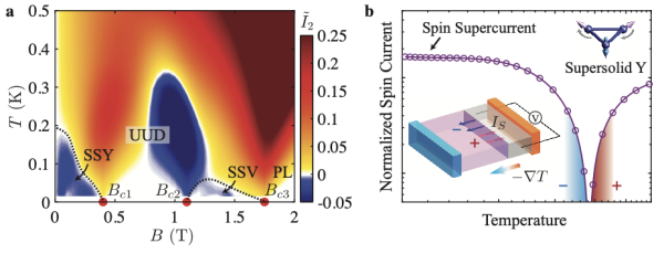 (a)利用自旋流计算结果得到自旋超固态的磁场-温度相图;(b)极低温下得到非零的持续超自旋流,插图分别为测量自旋塞贝克效应的实验设置(左下)和Y-型超固态(右上)示意图