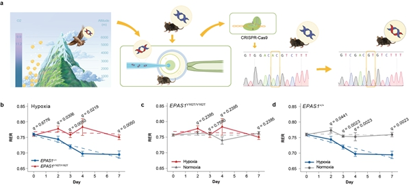 中国科学院动物研究所研究团队利用携带猎隼EPAS1基因突变的“隼型小鼠”模型,揭示了其维持糖脂代谢稳态的新机制。此前,团队在快速适应高原的猎隼中发现EPAS1(低氧诱导因子)存在关键突变。该基因同时调控糖脂代谢。团队通过CRISPR-Cas9构建突变小鼠,并将其与野生型小鼠置于10% O₂(模拟海拔5000米以上)慢性低氧环境中。结果显示,野生型小鼠呼吸交换率(RER)显著下降,表明代谢偏向脂肪;而隼型小鼠RER稳定,说明其能维持糖脂平衡。整合肝脏代谢组学、转录组学及分子实验发现:突变EPAS1与ARNT亲和力降低,与pVHL结合增强,导致其蛋白活性下降,从而钝化过度低氧反应。这使葡萄糖、脂肪酸等关键代谢物更快恢复至常氧水平,避免单一底物耗竭或堆积。该优势在野生猎隼种群中得到验证。此外,隼型小鼠在低氧下体重恢复更快、氧化应激更低,在4% O₂急性低氧中生存时间更长、存活率更高。研究还指出行为可塑性(如呼吸、摄食调节)对代谢稳态的重要作用。