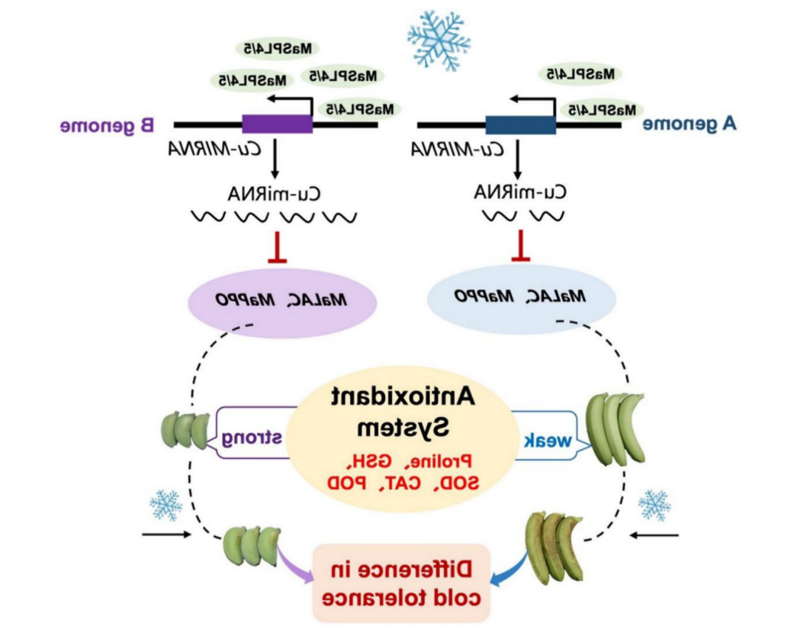 中国科学院华南植物园团队研究发现,两种基因型(AAA型、ABB型)香蕉的耐冷性差异与Cu-miRNA的积累量密切相关。上游转录因子MaSPL4/5的表达量及其对Cu-MIRNA基因的调控强度,是导致Cu-miRNA差异积累的关键。耐冷性更强的ABB型香蕉中,MaSPL4/5表达更高,能更强激活相关基因,使Cu-miRNA含量更高。