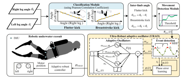 水下勘探、救援等任务中,潜水员需通过调整打腿频率和动作模式控制前进速度。中国科学院深圳先进技术研究院基于自主研制的PEAKED柔性潜水助力外骨骼,提出URAO超鲁棒自适应振荡器动作相位估计方法,解决了水下高频突变打腿动作的精准预测问题。