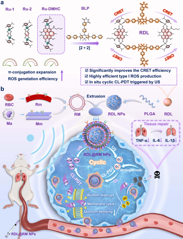 团队先构建了高效I型光敏剂,再将其与化学发光供体整合为超分子光敏剂RDL,实现97%的能量转移效率。超声激活后,该材料可通过循环反应持续生成高活性羟基自由基。辅以细胞膜包覆的仿生靶向设计,材料能精准富集在炎症部位,清除深部缺氧组织的病原体,为肺炎等深部感染的精准治疗提供了新方案。