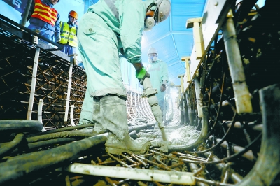 昨天,在国家雪车雪橇中心,施工人员正在对赛道进行混凝土喷筑作业。北京冬奥会期间,这里将承担雪车、钢架雪车、雪橇3个项目的比赛。(饶强摄)