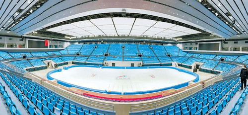 首都体育馆完成制冰工作,工作人员在进行冰面周边防护垫安装等收尾工作(北京日报记者 饶强 摄)