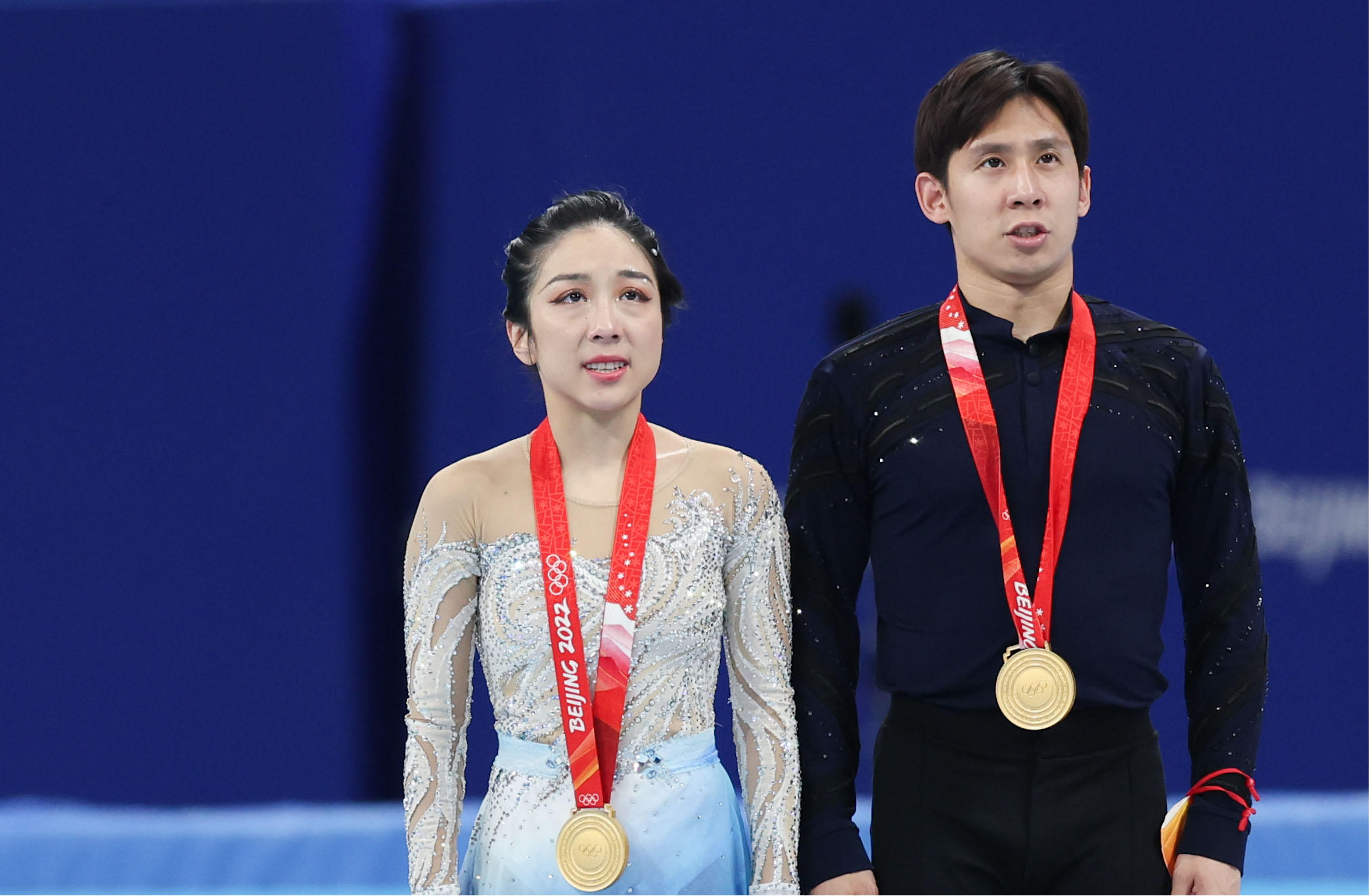 2月19日,中国选手隋文静(左)/韩聪在奖牌颁发仪式后庆祝。当日,北京2022年冬奥会花样滑冰双人滑自由滑比赛在首都体育馆举行,中国选手隋文静/韩聪夺得双人滑冠军。(图/盖蒂图片社)