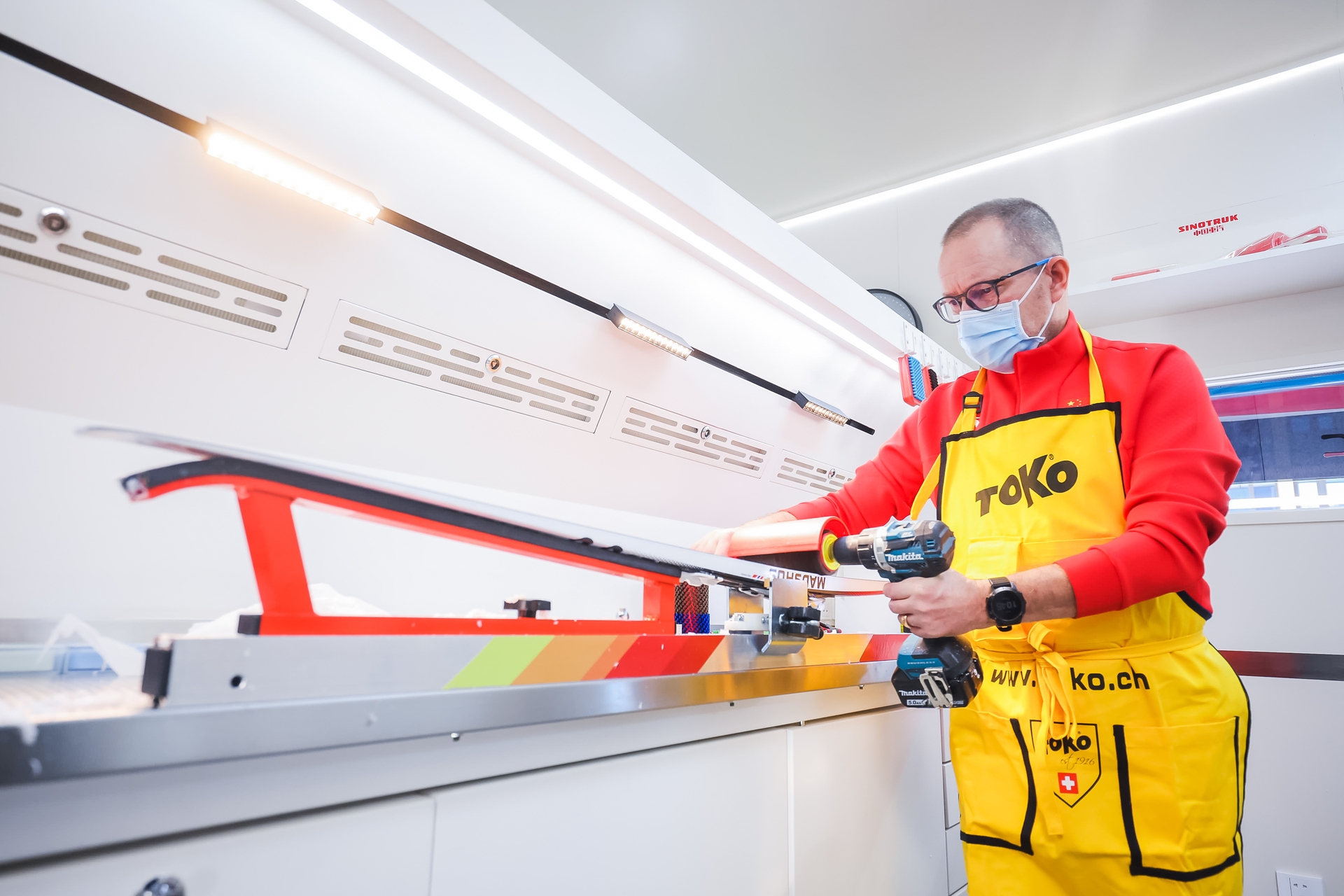对于滑雪项目来说,雪蜡能有效提升滑雪板的可操控性和滑行速度,直接影响运动员的竞赛成绩。而受赛道雪质、温度、空气湿度等因素影响,滑雪运动员通常在到达赛场后才能选择打哪一种雪蜡,因此先进的雪蜡车在备战参赛过程中尤为重要。雪蜡车通常由辅助车、主车和备用牵引车头组成,主车的扩展区内设有雪蜡台、雪板柜、干湿分离的卫生间,以及运动员休息区、热身区等,六个雪蜡台可同时进行打蜡。此外,由于打蜡时会产生烟尘,车内通常还配备新风系统。在欧美冰雪强国,雪蜡的生产和打蜡设备、专业技术人员培养都达到了很高水平,中国此前在这方面还存在不小的差距。