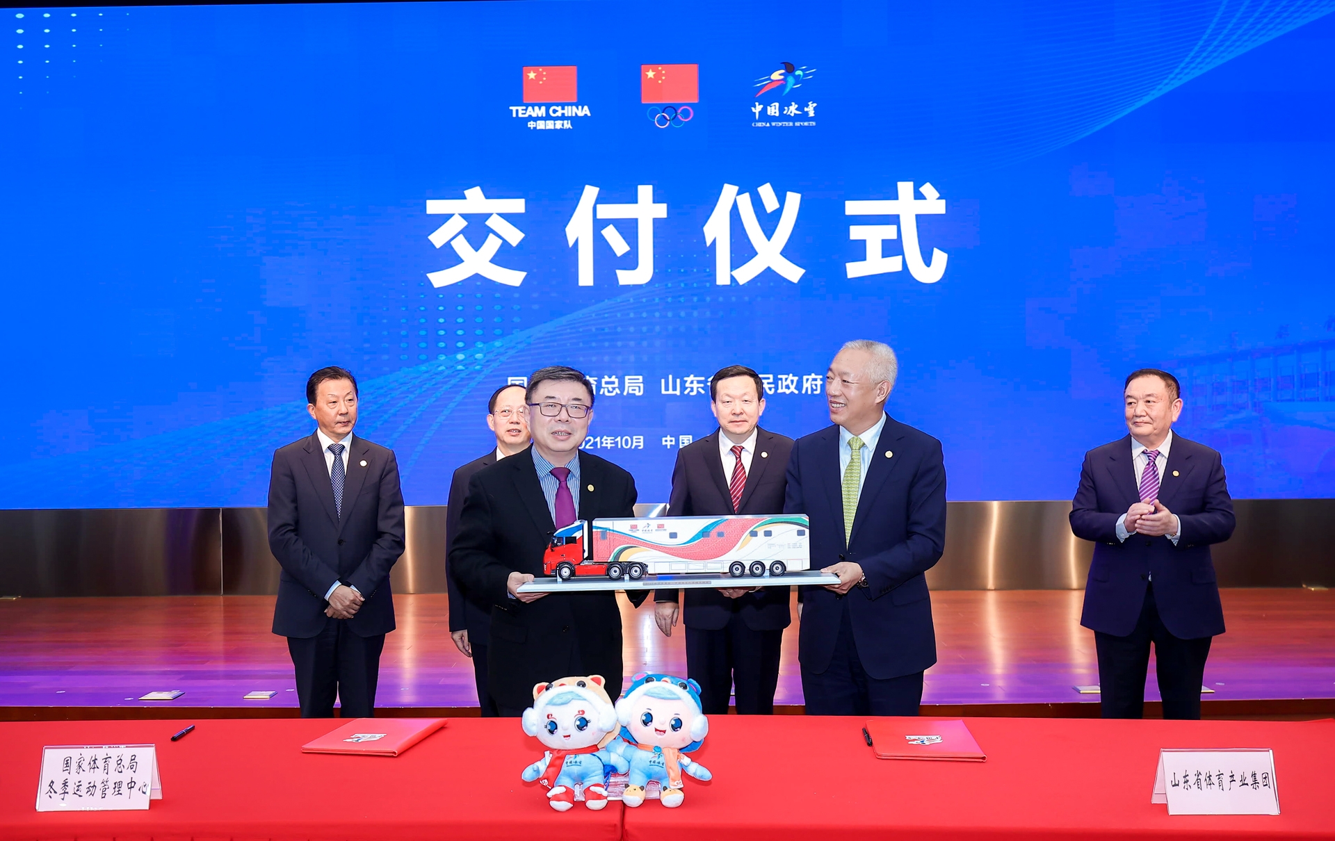 仪式上,国家体育总局冬季运动管理中心与山东省体育产业集团签署了《关于雪蜡车交付使用及冬奥任务攻关合作协议》,山东省副省长凌文向冬运中心主任倪会忠交付了雪蜡车模型。(王笑笑)