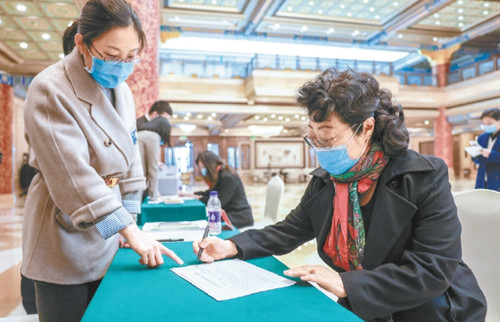 三月三日下午,出席十三届全国人大四次会议的北京代表团代表陆续来到北京会议中心驻地报到(北京日报记者 潘之望 摄)