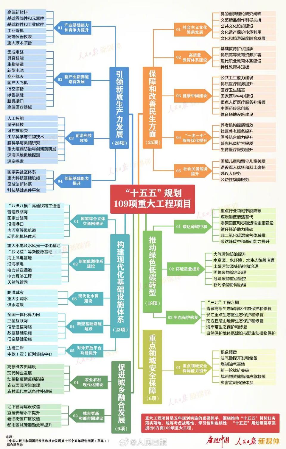 重大工程项目是五年规划实施的重要抓手。围绕推动“十五五”目标任务落实落地,统筹考虑战略性、牵引性和连续性,“十五五”规划纲要草案提出6方面109项重大工程。一图看十五五109项重大工程项目↓↓奋进中国,加油!