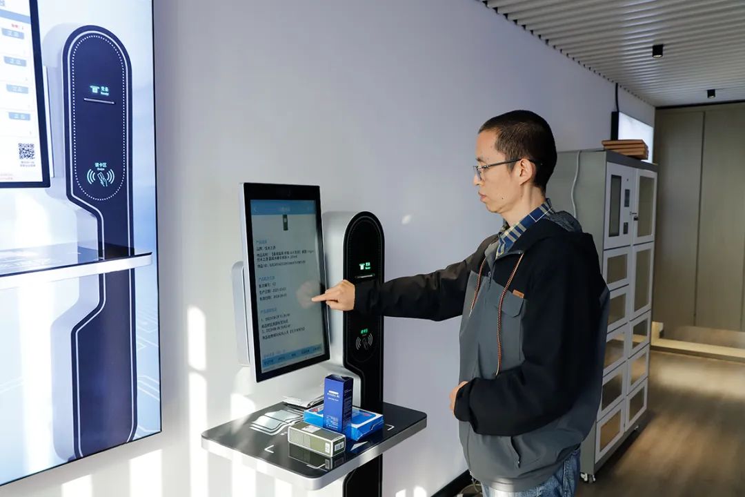 工作人员通过自助收银机查看商品防伪认证和全部溯源路径