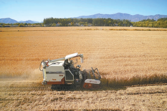 10月23日,海淀区上庄镇京西稻智慧农场示范基地开始进入收获阶段,图为智能收割机进行无人收割作业。