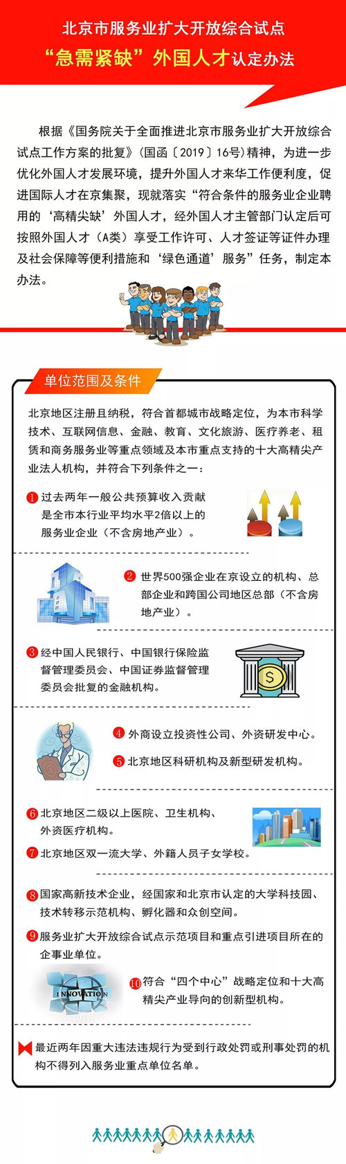 日前,北京市科学技术委员会(市外国专家局)、北京市商务局、北京市人力资源和社会保障局联合颁布了《北京市服务业扩大开放综合试点“急需紧缺”外国人才认定办法》 ,旨在进一步优化外国人才发展环境,提升外国人才来华工作便利度,促进国际人才在京集聚。